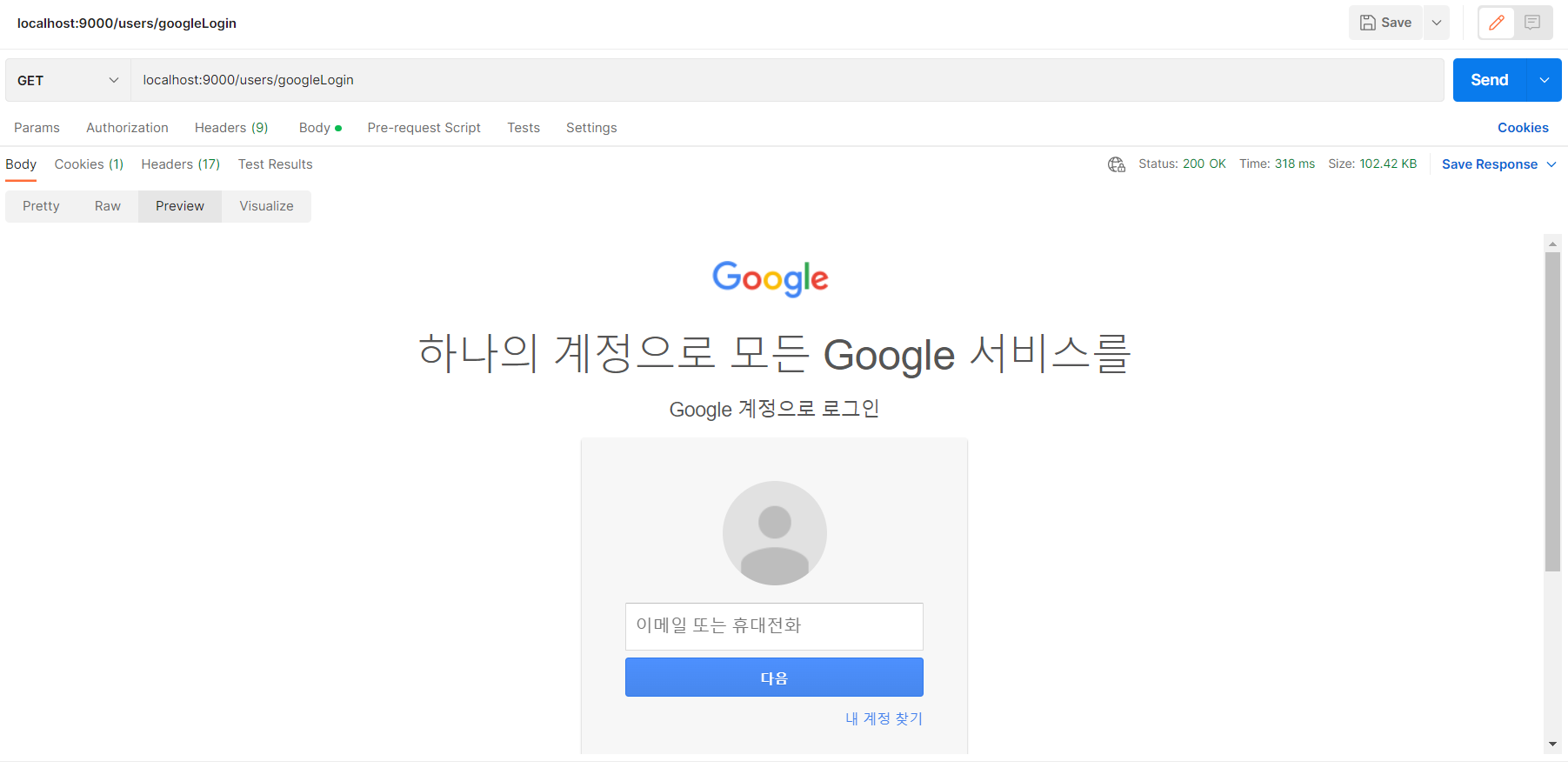 localhost:9000/users/googleLogin으로 request하면 일련의 과정을 거쳐 소셜 로그인 페이지가 렌더링된다.