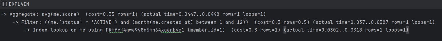 상단의 실행 계획은 사용자 평균 점수 조회 쿼리문이다.