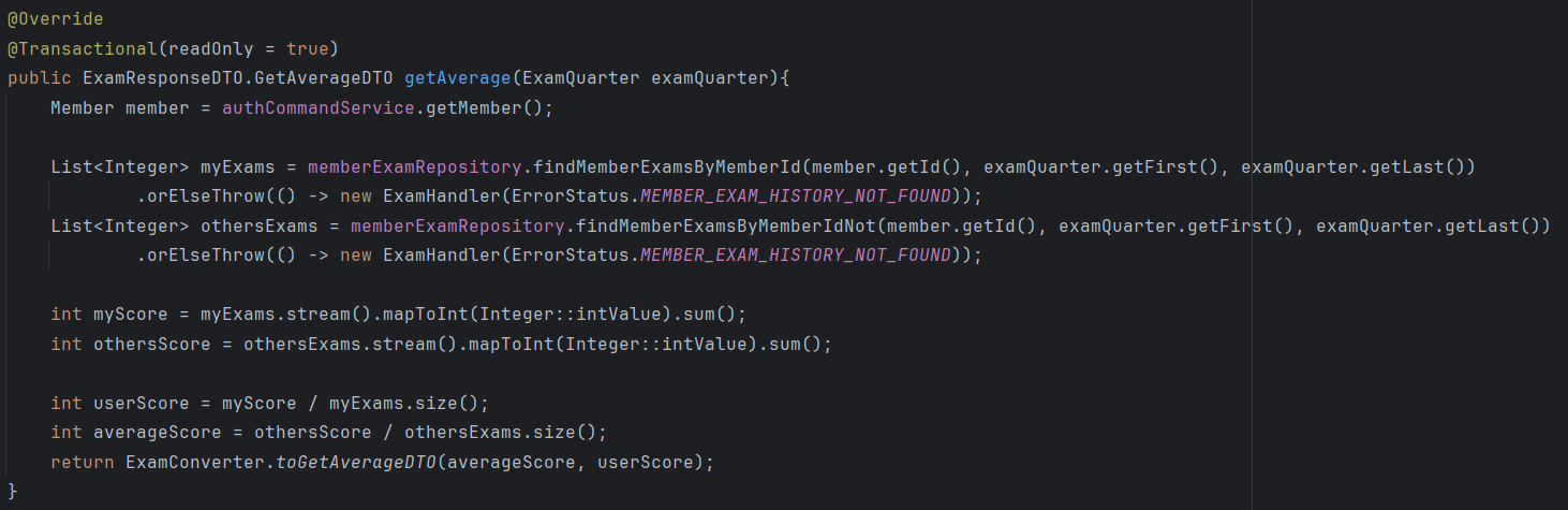 MemberExam 객체 리스트, 혹은 MemberExam (score) 객체 리스트만 반환하는 repository 메서드를 생성하여 재사용이 가능하게끔 나중에 리팩토링하면 좋을 거 같다~ 라고 팀원들과 얘기했었는데, 테스트를 통해 결과를 확인하니 그러지 않아도 될 거 같다 ㅎㅎ..