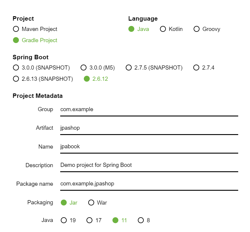 Project Metadata에서는 Artifact는 jpashop, Name은 jpabook으로 설정해주고, 자바 버전은 11로 해준다.