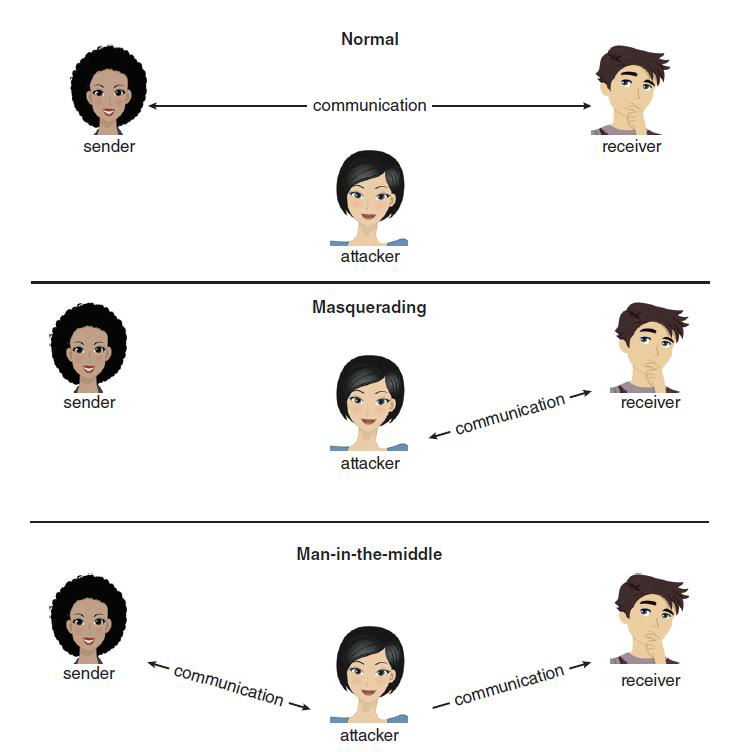 - 스니핑 (sniffing) : 침입자가 능동적으로 다른 상대방들의 네트워크 트래픽을 intercept